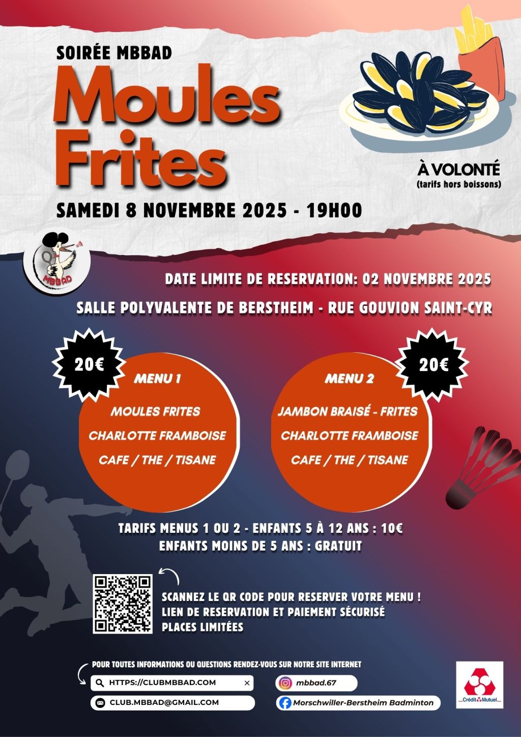 Marquez vos calendriers ! Le club de badminton Morschwiller Berstheim Badminton (MBBAD) est ravi de vous convier à sa traditionnelle et toujours très attendue soirée moules frites, un événement chaleureux et gourmand qui rassemble les membres du club, leurs familles et tous les amoureux de bonne chère dans une ambiance conviviale.